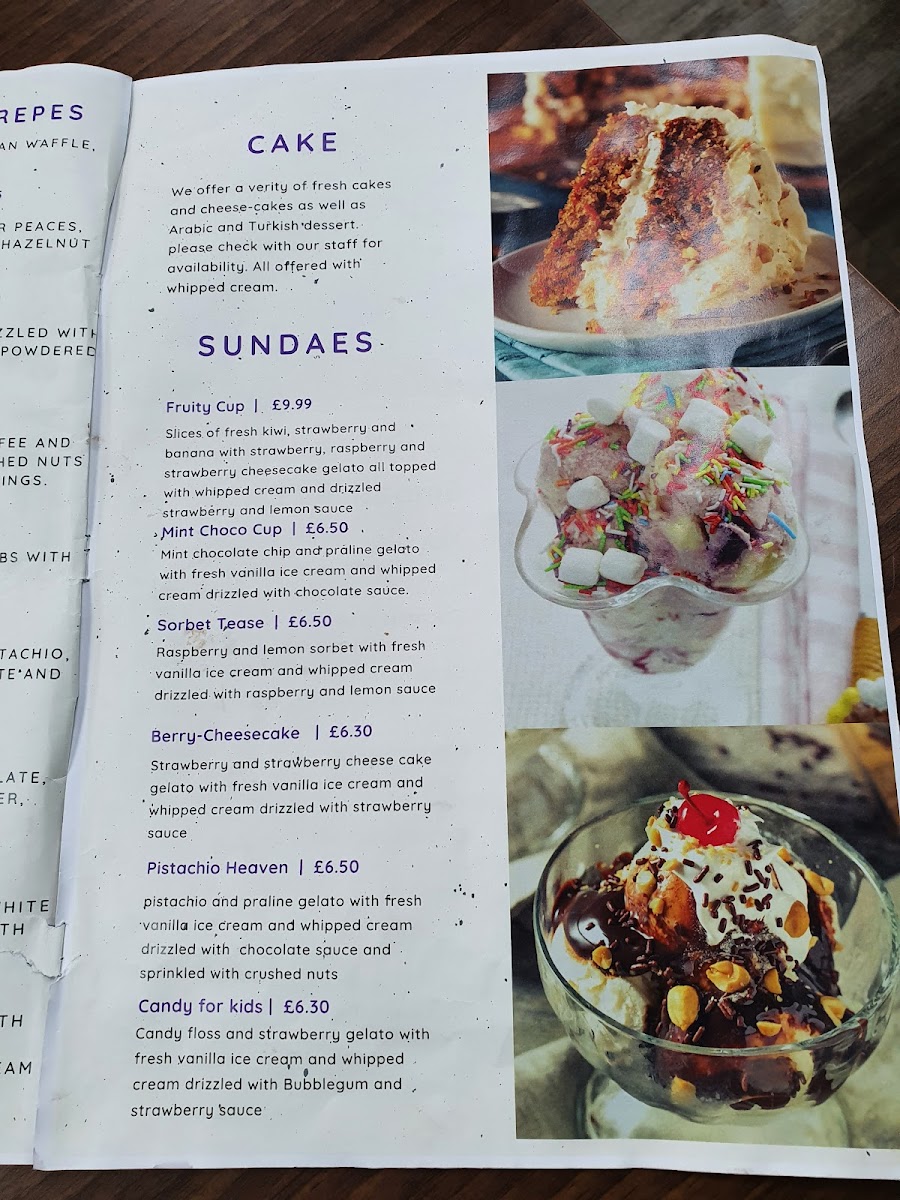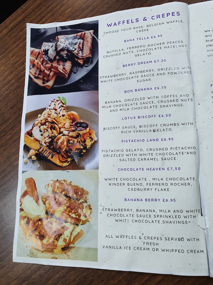 Located in Bishopston, Bristol, this dessert shop offers a diverse menu focused on a variety of Arabian and international sweet treats alongside a selection of beverages. The menu is structured to cater to different tastes with categories including traditional desserts, specialty crepes, cakes, pastries, and drinks.